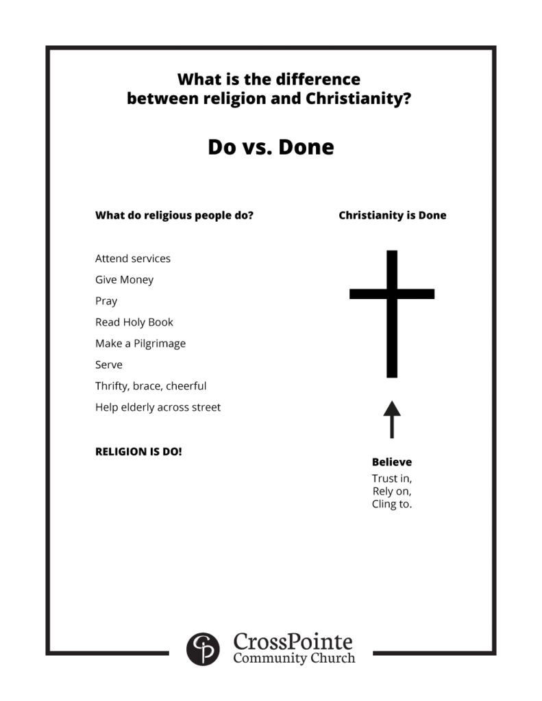 ‘And,’ you can continue, ‘One of the reasons this is good news is because we never have to worry about when we have done enough to be accepted by God and go to heaven. Right? If we adopt the religious point of view based upon what we do, we will never be at peace about when we have done enough.’