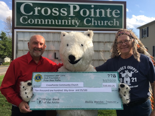 Wednesday afternoon, I met Chief Polar Bear, Alan Robbins, and his trusty wife, Vanna, inside the Chippy costume, out by our church sign for a final Where’s Chippy photo op; in which Alan presented me as CrossPointe’s representative a check for $10,159! Yes, you heard right . . . $10,159. We are so blessed to be one of the recipients of the proceeds from this marvelous event sponsored, of course, by our local Chippewa Lake Lions Club.
