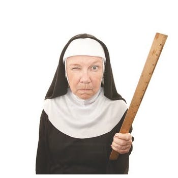 When I was 12, the public school teachers went on strike. So my brother and I transferred to a catholic school in a town nearby. This was the first time that I got to experience nuns as teachers. These nuns were scary and intimidating. Or they seemed to be at the time.