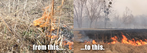 Tom lit a second match, dropped the match into the weeds, the weeds caught fire, but just when my brother raised his foot to stomp out the fire, Mark and I grabbed him and held him back. The fire quickly spread.